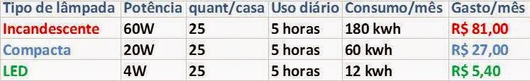 Com a crescente preocupação devido ao baixo nível dos reservatórios das hidrelétricas, se faz necessário buscarmos alternativas para reduzir o consumo de energia. Uma delas é a substituição de lâmpadas convencionais por modelos de baixo consumo. Veja abaixo comparativo de consumo entre os modelos mais utilizados: Consideramos uma residência com 25 lâmpadas ligadas em média 5 horas por dia.
