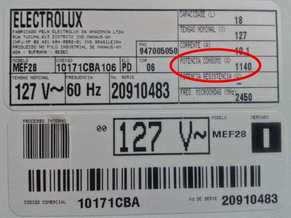 Todo aparelho elétrico possui potência elétrica que é expressa em Watts (W). Esta informação consta no manual ou na etiqueta de identificação do produto (ver foto).